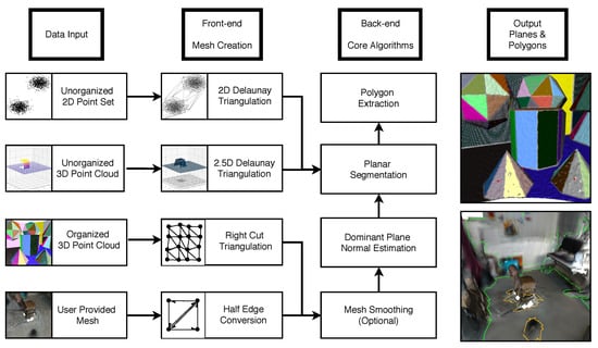 Overview of Polylidar3D. Input data can be 2D point sets, unorganized/organized 3D point clouds, or user-provided meshes. Polylidar3D’s front-end transforms input data to a half-edge triangulation structure. The back-end is responsible for mesh smoothing, dominant plane normal estimation, planar segmentation, and polygon extraction. Polylidar3D outputs both planes (sets of spatially connected triangles) and corresponding polygonal representations. An example output of color-coded extracted planes from organized point clouds is shown (top right). An example of extracted polygons from a user-provided mesh is shown (bottom right). The green line represents the concave hull; orange lines show interior holes representing obstacles.
