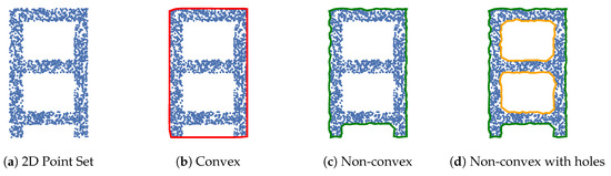 Example polygons that can be generated from plane segmented point clouds. (a) 2D point set representation of a floor diagram with interior offices; (b) Convex polygon; (c) non-convex polygon; (d) and non-convex polygon with holes. The exterior hull (green) and interior holes (orange) are indicated.