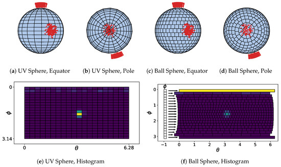 Examples of integrating normals from two identically “noisy” planes (red arrows, Gaussian distributed) into a UV Sphere (a,b) and Ball Sphere (c,d). Note the anisotropic property of sphere cells caused by unequal area and shape; (e) The UV Sphere histogram is unable to detect the peak at the pole; (f) The Ball sphere is able to detect both peaks, but the north pole cell is significantly larger leading to an incorrectly higher value than the equator cell.