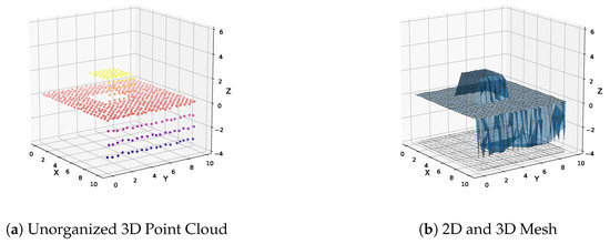 An unorganized 3D point cloud is an arbitrarily ordered array of points denoted with an index . An organized 3D point cloud is structured with 2D indices such that . Neighboring 2D indices () and () represent 3D proximity relationships between and when they lie on the same surface [6]. These 2D indices create an image space with M and N denoting the rows and columns. Note that the 2D indices can be collapsed to a 1D stacked array by . A triangular mesh with k triangles is defined by