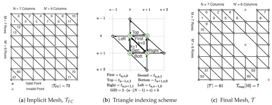 Example conversion of a 7 × 7 Organized Point Cloud (OPC) to a half-edge triangular mesh. Points are represented by circles; red indicates an invalid value (e.g., 0 depth measurement). (a) Implicit mesh of OPC with right cut triangles, . A unique global id GID = 2 · (u · (N − 1) + v) + k is shown inside each triangle; (b) Indexing scheme to define GIDs for triangles in ; (c) Final mesh with triangles created if and only if all vertices are valid. Unique indices into are marked. maps between GIDs in to .