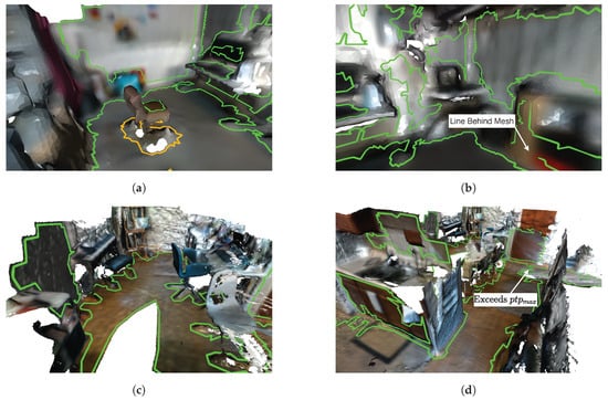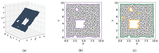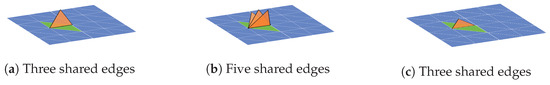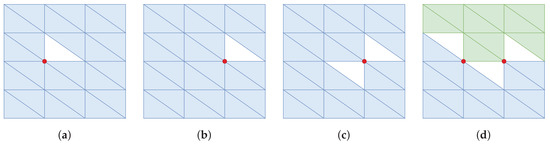 Figure 6 shows examples of non-manifold meshes where condition (1) is violated. Polylidar3D handles violations of (1) using methods from our previous work [14]. The missing triangles (shown as white) are explicitly captured as holes inside a polygon for Figure 6a–c, while the mesh is split into two polygons for (Figure 6d). Figure 7 shows cases of non-manifold meshes that violate condition (2). No mesh generated per Section 4.1 and Section 4.2 will violate (2) because triangulation occurs in 2D space so all edges share at most two triangles. However a user-provided 3D mesh may not satisfy condition (2).