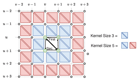 The algorithm partitions triangle smoothing in image space coordinates, smoothing both the first and second triangles as one unit of work. Each triangle’s normal is updated using centroid and normal information from neighboring triangles. The neighbors of a triangle are determined by a user-configurable kernel size as shown in Figure 8. Note that defining neighbors in this way mixes both n-ring and -ring triangle neighbors. However the exponential decay of the bilateral filter in Equations (4) and (5) ensures that only triangles of similar properties (close in position and orientation) will be integrated into the smoothed normal. Neighbors are not integrated if they have NaN values for their centroid/normal. The end result is smoothed normals for ; however, what is actually desired are smoothed normals for per Figure 5c. This is quickly achieved by using to identify the valid normals for . Zheng et al. [29] follows up with vertex updating, but we do not perform this step. Vertex updating is an expensive operation which provides minimal benefit for triangle region growing downstream. Only the smoothed normals are needed in Polylidar3D.
