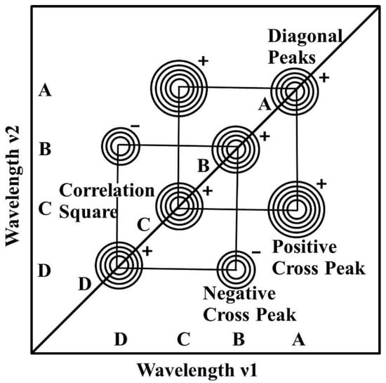 A schematic example of the synchronous 2D correlation spectrum in the form of a contour map is shown in Figure 1. A synchronous spectrum is symmetric along the diagonal line corresponding to coordinates ν1 = ν2. Correlation peaks may appear at both the diagonal and off-diagonal positions. The peaks along the diagonal line are designated as auto-peaks. In the example spectrum shown in Figure 1, there are four distinct auto-peaks located at the spectral coordinates A, B, C and D. The magnitude of the auto-peak intensity, which is always positive, represents the overall extent of spectral intensity variation observed at the specific spectral variable t during the observation interval between pmin and pmax. Thus, any regions of a spectrum that changes the intensity under a given perturbation will show strong auto-peaks, while those remain nearly constant will develop few or no auto-peaks. While cross peaks are located at the off-diagonal positions represent simultaneous or coincidental changes of spectral intensities observed at two different spectral variables, ν1 and ν2. The signs of auto-peaks are always positive, but the signs of cross peaks can be either positive or negative. In the example shown both A, B, C and D form auto-peaks in the diagram. Both A and C, B and D form cross peaks. The sign of cross peaks at the spectral coordinates A and C is positive, indicating that both of bands increase (or decrease) in magnitude simultaneously. However, the cross peaks at the coordinates B and D is negative indicating that the intensity change of one component is increasing while the other is decreasing.