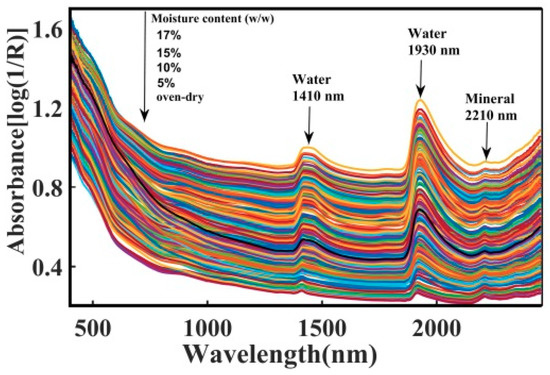 To visualise how the moisture dominates the spectroscopic characteristics of moist soil, Figure 3 depicts the absorbance spectra of the oven-dried soil together with other samples dosed by moisture contents up to 17%. The overall absorbance of the soil increases with moisture content particularly in the near infrared region due to the increasing the quantity of the O-H functional groups [74]. It is seen that all spectra exhibit similar features with two prominent water absorbance peaks located at about 1410 nm and 1930 nm. The small feature at 2210 nm has been identified related to the minerals in the soil [57,75,76] while the two prominent humps at 1410 nm and 1930 nm are partly due to the absorptions by the vibrational of the hydroxyl group in the water molecules. The peak at the 1410 nm is the compound absorptions due to the soil mineral and organic matter [60,61,77]. The peak at around 2210 nm is seen insensitive to the increase of moisture content and it appears to be less correlated with the SOM content [36].