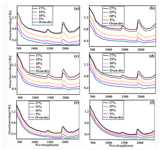 Shows the raw absorbance plots of soil samples that dosed by various moisture levels for the soil organic matter (SOM) content of: (a) 0.40%, (b) 1.12%, (c) 2.12%, (d) 3.35%, (e) 4.51% and (f) 7.92%.