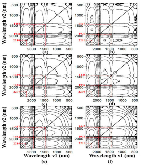The contour plots of the synchronous two-dimensional correlation spectroscopy (2D-COS) of the soil samples that have SOM content of: (a) 0.40%, (b) 1.12%, (c) 2.12%, (d) 3.35%, (e) 4.51% and (f) 7.92%. Note that the 2D-COS is formed by using spectra of samples that have been dosed by various moisture contents in each category of SOM content.
