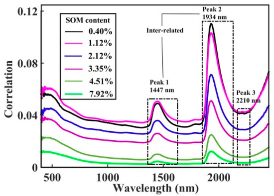 As depicted in Figure 5, the moisture correlation strength of the auto-peaks is seen to reduce with the strongest correlation occurring at 1934 nm, then it becomes weaker at the 1447 nm and finally the weakest is found at the 2210 nm wavelength (see Table 2 for more information). At the same time, it is observed that the effect of moisture on the SOM content follows the same trend; when the SOM content is increased from 0.40% to 7.92%, the moisture correlation strength for these three peaks (1934 nm, 1447 nm and 2210 nm) are seen to reduce respectively from 0.1104 to 0.0122, from 0.0490 to 0.0044 and from 0.0417 to 0.0034, which equates to about 90% reduction of moisture effect over all three peaks when the SOM content is increased. These data give strong evidence that the soil moisture features overlap with the SOM characteristic peaks significantly, especially when the SOM content is in low concentration thus making the SOM content detection extremely difficult in these low SOM content situations (<1%). Consequently, based on this result it is suggested that the moisture bands at around 1934 nm, 1447 nm and 2210 nm should be removed to improve the accuracy of the SOM predictions.