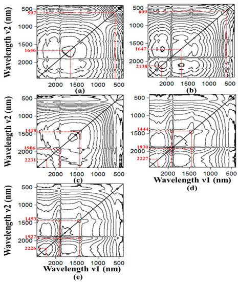 The contour plots of the 2D-COS of the soil samples with various SOM content (i.e., SOM as perturbation variable) for the moisture content of: (a) oven-dry, (b) 5%, (c) 10%, (d) 15% and (e) 17%. Note that the 2D-COS is formed by using spectra of samples that have various SOM content in each category of the moist soil sample.