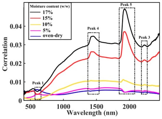Two distinct auto-peaks at around 597 nm and 1646 nm, have been seen clearly from the contour plot of the correlation synchronisation map of the oven-dried soil samples (see Figure 7a). A weak, but discernible peak begins to emerge at around 2138 nm when the moisture content is increased from oven-dry to 5% (see Figure 7b). This auto-peak is then seen red-shifted to about 2220 nm and at the same time, the correlation strength of this peak is increased from 0.0054 to 0.0299 (i.e., 450% increase) when the moisture content is further increased from 5% to 17% (see Figure 7b–e and Table 3). Two other auto-peaks near to 1934 nm and 1447 nm are also seen increasing in intensity as well as their correlation strengths, when the moisture content is further increased from 10% to 17% (see Figure 7c–e). This result may give further support of the analysis presented in the last section, that the three auto-peaks near to 1447 nm, 1934 nm and 2210 nm are greatly affected by the moisture in the soil. Previous study also suggested that the auto-peak at around 2138 nm might be related to the Al-OH and Mg-OH absorption bands [78]. Hence, it can be concluded from Figure 7; Figure 8 that the auto-peaks near to 597 nm, 1646 nm and 2138 nm are related to the SOM characteristic features. These SOM features are very weak in the vis-NIR spectral range and they could hardly be observed directly from the one-dimensional spectrum (please refer to Figure 3). However, it is shown in this study that this subtle SOM-related features can be enhanced, and subsequently revealed, by using the 2D-COS technique.