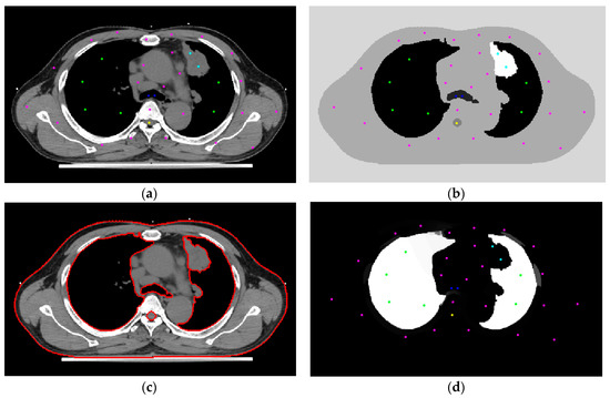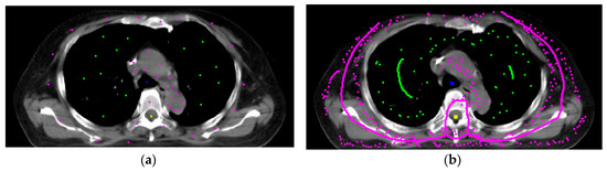 Figure 4a,b show the seeds’ automatic generation and vanishing results. The 2D RW processes each image slice-by-slice. Figure 4a is the initial settings of the seeds, and Figure 4b is the automatic seed generation on its next slice. From Figure 4b we see some seeds forming a ‘curve’, which is generated from the skeleton scheme described in Section 2.5. After segmentation, contours of all categories are obtained. Figure 5 show two views of the 3D visualizations of one patient. The cyan color is the body shape, the green color denotes the lungs, and the red color shows the GTV.