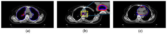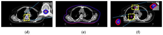 Figure 3 shows the results of Section 2.4 and Section 2.5. Figure 3a–f show different targets’ segmentation results. These are the lungs, airway, heart, spinal cord, body, and tumors, respectively. The blue delineations are automated results, whereas the red lines were made by the radiologist. For comparison, these two results are superimposed on the raw image. All segmentation was done using automatic seed selection, as described in Section 2.4 and Section 2.5.