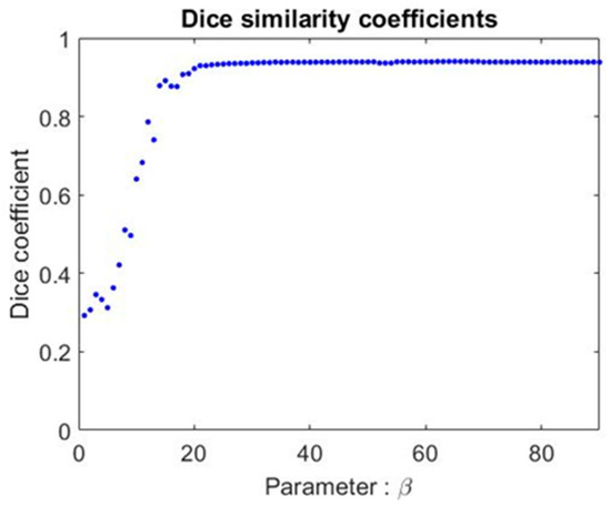 The Dice coefficient using different β values under the contouring of the lung. The two sets for comparison of the similarities are our automated contouring and the expert’s manual delineations.