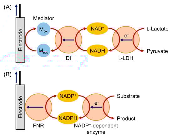 (A) Schematic view of MET-type bioelectrocatalysis of l-lactate dehydrogenase (l-LDH) and FMN-containing diaphorase (DI); (B) schematic view of bienzymatic bioelectrocatalysis using an NADP+-dependent enzyme and ferredoxin-NADP+ reductase (FNR).