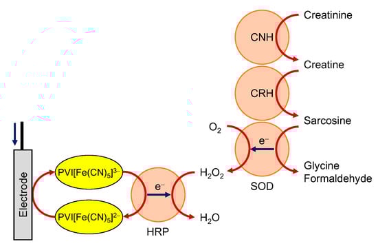 Schematic view of multi-enzymatic creatinine biosensor. CNH, CRH, SOD and PVI[Fe(CN)5] 2−/3− indicate creatinine amidohydrolase, creatine amidohydrolase, sarcosine oxidase and pentacyanoferrate-bound poly(1-vinylimidazole), respectively.