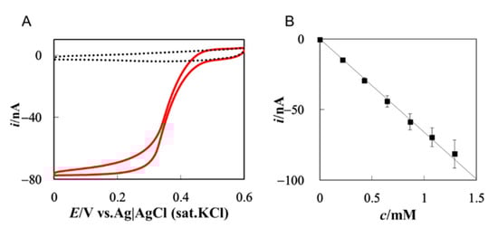 The simplest case is extremely fast DET-type bioelectrocatalysis at a microdisk electrode. In this situation, the substrate concentration at the microelectrode surface is regarded as zero, that is, diffusion-controlled limiting current conditions are realized. Some of multicopper-oxidases (MCOs) reduce O2 to water with sufficiently high activity at the surface of mesoporous electrodes by DET-type bioelectrocatalysis. Mass-transfer-controlled DET-type bioelectrocatalysis was realized at MCO-modified porous gold microdisk electrodes [118]. The porous electrode was employed to increase the effective surface area and the probability of orientations suitable for DET-type bioelectrocatalysis thanks to curvature effects [19,119,120]. Figure 4A shows voltammograms recorded at a Cu-efflux oxidase-modified porous gold microelectrode (solid line) with and (dotted line) without oxygen. The sigmoidal curve indicates the DET-type bioelectrocatalysis of O2 reduction. A clear potential-independent limiting current was observed. The limiting current linearly increased with the bulk concentration of O2, as shown in Figure 4B. The solid line in Figure 4B shows the theoretical sensitivity calculated with Equation (15) using the literature value of DS and the microscopically measured r. The agreement between the experimental and theoretical sensitivities verifies that the response of the constructed O2 sensor is truly controlled by the mass transfer of O2. Since the sensitivity of the sensor is independent of the activity of CueO, the sensor shows excellent reproducibility and stability at a given temperature.