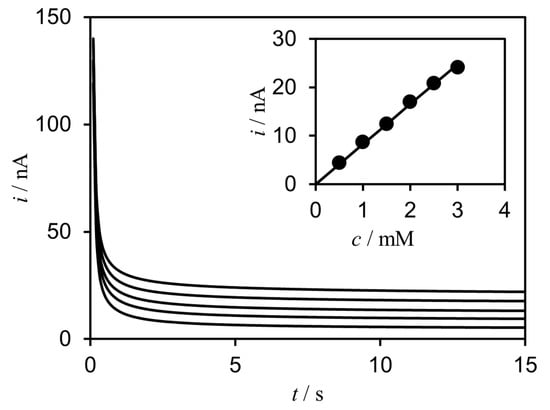 The situation of MET-type bioelectrocatalysis at a microelectrode is more complicated than that of DET-type bioelectrocatalysis due to the diffusion of the mediator. However, when a large amount of active enzymes exist in the system, it is possible to realize the substrate–diffusion-controlled MET-type bioelectrocatalysis at a microdisk electrode. According to this concept, a MET-type glucose sensor was constructed using a microdisk electrode, 1,2-benzoquinone and FAD-GDH [39]. The current response quickly reached a steady-state (Figure 5). The linear range of the sensor was from 0 mM to 3 mM of glucose while the concentration of the mediator was 1 mM in the system (inset in Figure 5). Obviously, the linear range was beyond the endpoint situation. Moreover, the current response of the sensor agreed with the diffusion-controlled value of glucose.