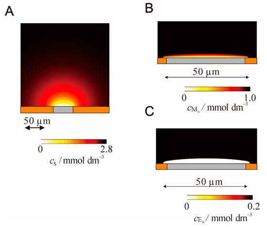 Concentration profiles of (A) substrate, (B) reduced mediator and (C) reduced form of enzyme around an microdisk electrode with r = 25 μm at a substrate concentration of 4 mmol dm−3, a mediator concentration of 1 mmol dm−3, an enzyme concentration of 0.2 mmol dm−3. Profiles calculated for the situation of 20 s after the potential step at the limiting current conditions. Reprinted from ref. [40] with permission from the PCCP Owner Societies.