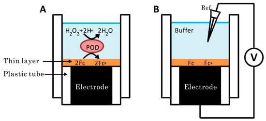 However, the response of an amperometric sensor depends on detection time, which limits practical application [4,9,11,12,13,26,32,33]. It is necessary for amperometric sensors to obtain steady-state currents. If one can use biosensors without calibration, it is easy to monitor the concentration of target analytes. In this sense, microelectrode detection was introduced to develop amperometric biosensors [38,39,40,41,42,43,44]. Nonlinear diffusion of the substrate at microelectrodes causes diffusion-controlled steady-state currents. In addition, microelectrode-type biosensors are suitable for miniaturization and reducing the volume of samples. On the other hand, coulometry that can determine the absolute quantity is an absolute analytical method. However, non-Faradaic background electricity (background integrated current during absolute electrolysis) becomes too large to be ignored, compared with Faradaic electricity to be measured at decreased concentrations of analytes. In order to overcome this issue, potentiometric coulometry based on MET-type bioelectrocatalysis has been proposed, in which the total electricity of an analyte in a small value of test solution is transferred to the mediator immobilized on an electrode, and the change in the redox state of the mediator is potentiometrically detected [45,46].