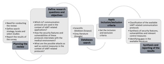 Our overall survey process relies on several predefined research questions relevant to IoMT-specific communication protocols. Based on these research questions, we have conducted an extensive research addressing the various technical/functional/security challenges of the IoMT-related communication protocols. Our main research questions (RQ) are as follows: