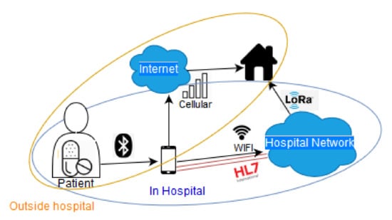 Mdhaffar et al. [60] present an loT-based health monitoring system in which medical data collected by sensors use a LoRaWAN infrastructure to transmit the collected data to a remote analysis module in a secure way. The system mainly focuses on monitoring glucose, blood pressure and temperature of patients residing in rural areas. Since in rural areas cellular network coverage may not always guarantee an efficient data transmission, LoRaWAN is an attractive alternative. Catherwood et al. [61] present an IoMT biofluid analyser that uses LoRa and Bluetooth to support long-range data transmission. The system employs a smartphone application to create a community-based healthcare examination platform for urinary tract infections. The transmitted distance in the above prototype ranged from 1.1 to 6 Km, based on a corresponding power density reduction.