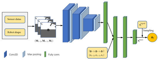 The architecture of the policy network. The input of the network is , which consists of three frames of egocentric local grid maps and three frames of local goal positions and offset orientation angles. The network computes the mean of the action, which consists of a linear velocity and an angular velocity. The resulting action is sample from a Gaussian distribution.