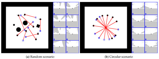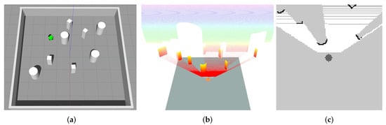Egocentric local grid maps are constructed from costmaps, which have been widely applied in robot navigation [46,47] and can be generated from various sensors or sensor fusion with strong noise resistance. We first receive a local costmap w.r.t. the robot i, then we can construct the egocentric local grid map by adding the robot’s configuration, i.e., its size and shape, in the costmap. There is a value in each cell of to represent the surrounding environment. In particular, cells of value 0 denote the obstacles and other robots around the robot. Cells of value 255 denote the free space, cells of value 100 denote the undetected place that is unknown for the robot and cells of value 200 denote the place that is occupied by the robot itself. An example of the training environment in the simulator is illustrated in Figure 1a. The generated egocentric local grid map for the robot 0 in this example is shown in Figure 1c.