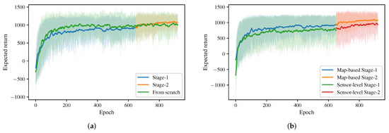 (a) Comparison of the expected return shown in epochs for the training process with two-stage curriculum learning and the training process without two-stage curriculum learning, i.e., from scratch. (b) Comparison of the expected return shown in epochs for the training process using Map-based policy and the training process using sensor-level policy.