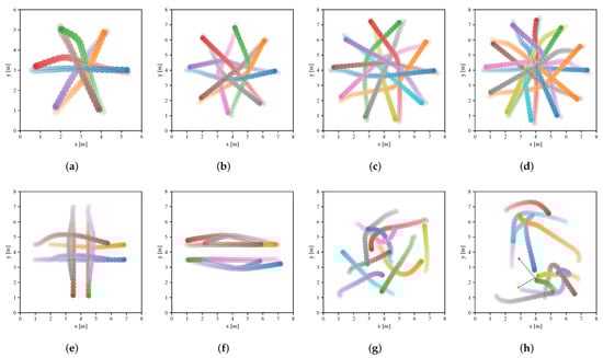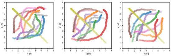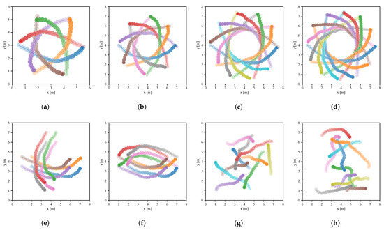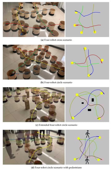 We first introduce a real-world swap scenario where two robots are required to move towards each other and swap their positions. Figure 17a illustrates the performance of the robots in this scenario, in which both robots successfully reach their targets without collision. Next, we extend the two-robot cross scenario by randomly placing some static obstacles to increase the difficulty. Figure 17b illustrates the performance of the robots in the new scenario, in which both robots still successfully reach their targets without collision. Figure 17b also shows that the robot can automatically wait for a moment and avoid the narrow opening when it observes that the other robot is going through the opening. Then, we further extend the scenario by asking a pedestrian to walk across the paths of both robots. Figure 17c illustrates the performance of the robots in this extended scenario, in which both robots adaptively slow down their speed and wait for the pass of the pedestrian before they each their targets successfully. Notice that pedestrians are not introduced in the training procedure of the collision avoidance policy in our approach and the shape and dynamic characteristics of pedestrians are quite different from other robots and static obstacles. However, the learned policy still performs well in the scenario with pedestrians. Later, we extend the two-robot scenario to involve three robots. We introduce the three-robot circle scenario where three robots are placed on a circle and their targets are set at opposite positions on the circle. Figure 17d illustrates the performance of the robots in this scenario, in which all robots successfully reach their targets without collision. At last, we extend these scenarios to involve four robots. Figure 18 illustrates the performances of four robots in these scenarios, in which all robots still successfully reach their targets without collision. In the four-robot cross scenario shown in Figure 18a, two groups of robots cross each other and reach their respective target points. Figure 18b shows the experimental results of the four-robot circle scenario, where four robots are placed on a circle and their targets are set at opposite positions. In order to further prove the generalization ability of our model in more complex environments, we added three static obstacles or two pedestrians to the four-robot circle scenario. The experimental results are shown in Figure 18c,d. All robots can reach their respective target points without collision in such a dynamic and crowded environment.