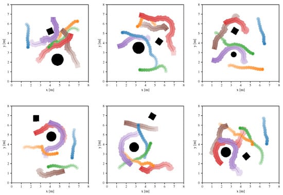 On the other hand, a trajectory-based agent-level decentralized method explicitly evaluates the future joint states of robots by anticipating other robots’ future trajectories. A subclass of non-cooperative methods [20,21] first estimates predicted paths of other robots, then plans a collision-free path for the ego robot. However, these predicted paths usually mark a large portion of the space to be unsafe in crowded environments, which leads to the freezing robot problem [22]. To overcome this problem, a subclass of cooperative methods [23,24,25,26] was proposed to take into account the interactions between robots. A cooperative trajectory-based method first infers other robots’ intents, computes jointly feasible paths of all nearby robots, then chooses paths with better quality, e.g., shorter time for every robot to reach their corresponding goals. However, it is hard to estimate other robots’ intents and computationally expensive to generate paths for every robot. Furthermore, the difference between the predicted path and the actual path of each robot grows greater when the time increases, which requires a rapid update for the method.