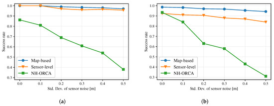 Table 1. Hyper-parameters of the NH-ORCA algorithm used in our comparison experiments. - Sensor-level policy: the policy generated by the DRL based approach proposed by Long et al. [42] and Fan et al. [43]. Different from our approach, their network considers the original 2D laser data (in a 1D form) as the input and uses 1D convolutions to handle the input. For a fair comparison, we trained this DRL-based approach in the same training process, i.e., the two-stage training process, as our approach. The learning curve of its training process is shown in Figure 4b, where we denote their approach as “Sensor-level” and our approach as “Map-based”. Note that our approach converges with a higher expected return in the training process.