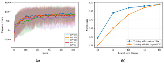 Figure 4a shows the learning curve for an ablation study to illustrate the effect of two-stage curriculum learning, where “Stage-1” denotes the expected return for the training process in the first stage, “Stage-2” denotes the expected return for the training process in the second stage, and “From scratch” denotes the expected return for the training process without using two-stage curriculum learning. Note that two-stage curriculum learning helps the policy to converge with a higher expected return, i.e., a better collision avoidance performance.