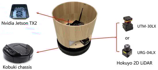 The robot is based on TurtleBot 2 with Kobuki base using either a Hokuyo UTM-30LX 2D LiDAR or a Hokuyo URG-04LX 2D LiDAR and an NVIDIA Jetson TX2. A wooden shell is placed on the top of the mobile platform to enable robots to detect each other.