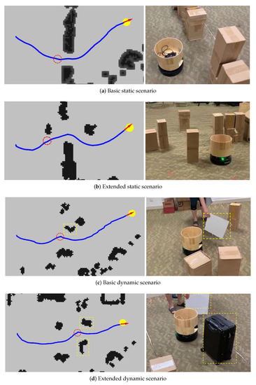 We first introduce a basic static scenario where some paper boxes are places as static obstacles to block the robot’s path from its starting position to its target. Figure 16a illustrates an environment of this scenario, in which the robot can successfully pass through a line of obstacles with a narrow opening. Next, we extend the scenario by adding obstacles to the front and the rear of the opening to increase the difficulty. Figure 16b illustrates an environment of such scenario, in which the robot can still successfully pass through the narrow opening. Then we introduce dynamic scenarios by allowing some obstacles to appear suddenly. In specific, Figure 16c illustrates an environment in which a cardboard appears suddenly in the moving path of the robot. Figure 16d illustrates an environment extended from the situation in Figure 16c, where a luggage moves across the path of the robot. In both environments, the robot successfully detects the dynamic obstacles and adjusts its movement in time to avoid the collision.
