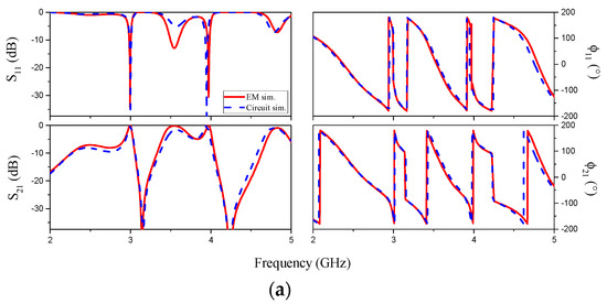 The specific electrical lengths for the upper and lower transmission line sections have been set to θu = 87.7° and θl = 88.3°, respectively, as these values are coherent with Equations (4) and (5). To evaluate Equations (4) and (5), we have first inferred the fringing capacitances through the parameter extraction procedure described in [36] and already used in [17]. The extracted element parameters are Csu = Csl = 30.2 fF. The resonance frequency of each slot resonator is directly given by the first transmission zero of the isolated branch.