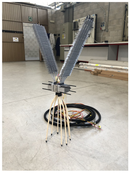 Each cold side heat exchanger has also been manufactured with the former procedure. Nonetheless, in this case, 500 long heat pipes have been inserted in the base of an aluminum fin dissipator. This dissipator has a base of 82 × 50 × and seventeen 40 × corrugated fins. Fins have also been inserted on the heat pipe tubes in order to increase the heat exchange area and therefore, improve heat dissipation to the environment. More specifically, 72 aluminum 104 × 27.5 × fins have been added with a separation of 5 .