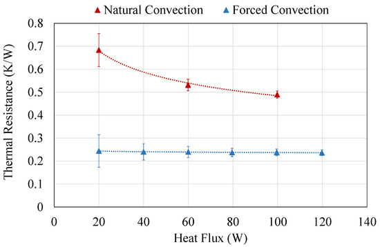 The former decrease is more noticeable for natural convection, where the thermal resistance diminishes from 0.68 K/W with 20 W, to 0.49 K/W with 100 . In contrast, for forced convection the thermal resistance barely decreases 0.01 K/W from 20 to 120 , presenting an average value of 0.24 K/W. The heat transfer coefficient in natural convection strongly depends on the temperature difference between the surface of the heat exchanger and the environment, improving with higher gradients. Nevertheless, in forced convection, this effect blurs in favor of the influence of wind velocity. Considering that this paper considers an outdoor application, the values of thermal resistance with forced convection are more representative.