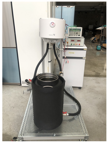 Apart from the characterization of the cold side heat exchanger, it is important to determine how much power can be generated with the designed prototype. At the laboratory, the experiments have been performed using the thermal bath depicted in Figure 4 as the heat source, while its analysis under real conditions is detailed in Section 6. This thermal bath is composed of a 10 water heater, an insulated 30 container, and a pump for the recirculation of the water used as the heat carrier. The designed prototype has been introduced in the insulated container, in direct contact with the water, which has been maintained at a practically constant temperature of 75 .