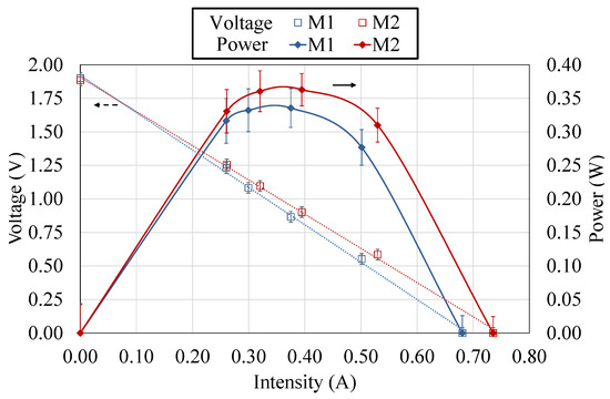 Figure 5 depicts, for the two thermoelectric modules M1 and M2, the voltage (left axis) and the power generated (right axis) with respect to the intensity. From left to right, the values correspond to open-circuit (OC), , , , 1 and short-circuit (SC). As can be observed, the behavior of both thermoelectric modules is quite similar. As the load electrical resistance decreases, the intensity increases and the voltage decreases, with a linear relationship between them. In both cases, the open-circuit voltage is approximately while the short-circuit intensity presents a value of around ( M1, and M2).