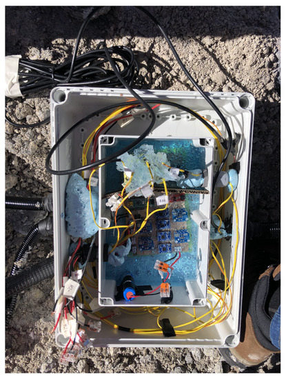 Finally, similarly to the prototype, and due to the harsh volcanic environmental conditions, it is necessary to protect the electronics to stand severe conditions. Figure 8 depicts the protection measures that have been taken. Thus, the PCB with all the electronics has been introduced in an IP67 plastic box and covered with Raytech magic power gel [66]. This box has been closed and introduced in another IP67 plastic box. Since the different cables need to be taken out of the boxes, cable glands have been installed with a Nylon conduit contractor, and the connections have been protected with self-amalgamating tape and polyurethane foam.
