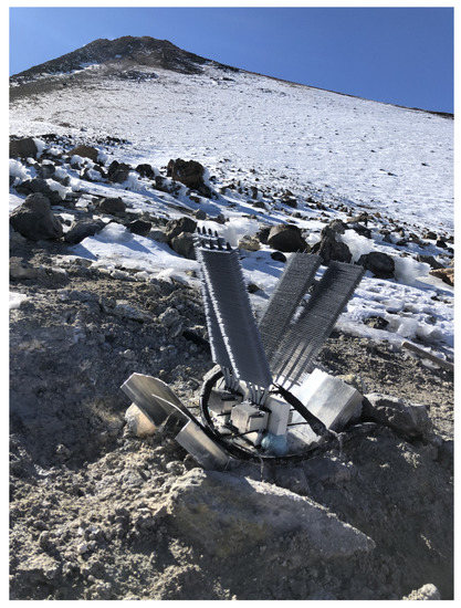 On 18th December 2019, the prototype was installed at Teide volcano (Canary Islands, Spain) with its associated electronics (Figure 9) and on the submission date of this manuscript, the prototype was still in operation. Teide is a stratovolcano located in the Canary Islands (Spain), an archipelago of volcanic origin that emerges in the Atlantic Ocean. With an altitude of 3718 , Teide is one of the most evident manifestations of the active volcanism of the islands, and therefore, it is widely monitored. Figure 10 details the location of the prototype, in the northern side of the volcano at an approximate altitude of 3500 , as well as the position of the gateway, 14 away with direct vision. As shown in Figure 9, in its installation, aluminum deflectors were added so that the volcanic gases are diverted, not coming into contact with the thermoelectric modules nor the cold side heat exchangers. Polyurethane foam was used for sealing the joints. Furthermore, polyethylene was also added in order to insulate the aluminum block of the hot side heat exchanger and the thermoelectric modules from the influence of ambient conditions.