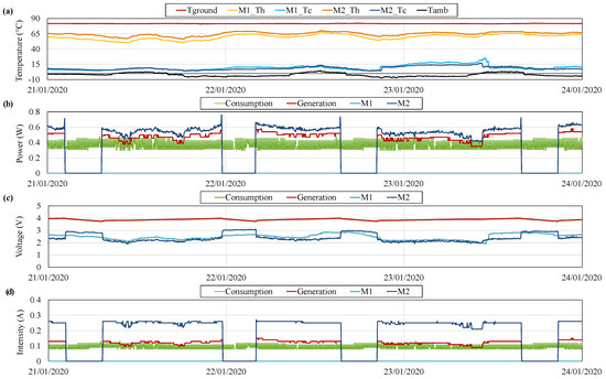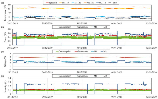 Figure 11 depicts the typical operation of the prototype, taking as reference the variables measured between 29 December 2019 and 2 January 2020. More specifically, Figure 11a shows the temperature of the ground , the hot and the cold side of two thermoelectric modules , , and , and the ambient temperature . Each monitored thermoelectric module belongs to one of the individual generators installed.