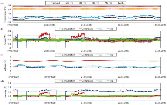 Figure 11b–d show the values associated with the measurements performed by means of the INA219s: power, voltage, and intensity respectively. In particular, these sensors, as shown in Figure 6, have been installed monitoring the individual power generated by the thermoelectric modules M1 and M2 of which the temperatures are also being measured (before the MPPT), the generation of all the thermoelectric modules (after the MPPTs and before the battery), and the consumption of the different devices (at the battery output).