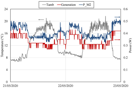 As shown in Figure 12, the total generation obtained with the former gradient is of just , lower than the average consumption. Therefore, the battery is gradually discharged although one thermoelectric module is in operation. When the voltage of the battery is lower than , another thermoelectric module starts its operation. The individual generation of this module is not being monitored, but it can be seen that the total generation, in red, exceeds the individual generation of M2, while M1 remains in open-circuit. When the battery voltage reaches , this second thermoelectric module switches to open-circuit, and again M2 is the only module in operation. On 20 May, the total generation with only M2 was higher than the consumption, completely charging the battery a couple of hours after the disconnection of the second module. Nevertheless, on the 21, when the second module switched to open-circuit, total generation with M2 was similar to the consumption. Hence, an equilibrium between generation and consumption can be observed, discharging the battery during the day and charging it during the night, but without reaching the upper nor the lower thresholds to switch to open-circuit or force the operation of a new module respectively. During this equilibrium period, the influence of ambient temperature in generation can be perfectly seen. This influence is more detailed in Figure 13, which shows the ambient temperature (left axis), the total power generation and the power generated by M2 (right axis) between 21 and 23 May 2020. Thus, during the day temperature increases, diminishing the available temperature difference and therefore reducing generation. During the night, this temperature decreases and generation increases.