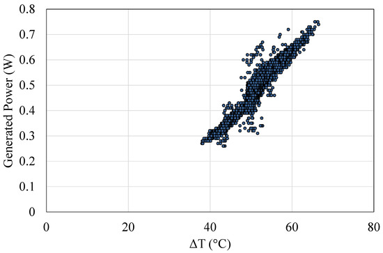 Utilizing the previous temperature constant heat source and with an ambient temperature of , each thermoelectric module has been individually connected to an electrical load resistance and its voltage and intensity have been measured for the calculation of the power generated. More specifically, short-circuit, 1 , , , and open-circuit conditions have been experimented and the uncertainties calculated again with [50]. In the experiments, the temperatures of the heat source , the hot and the cold side of the thermoelectric modules and , and the ambient temperature have also been measured.