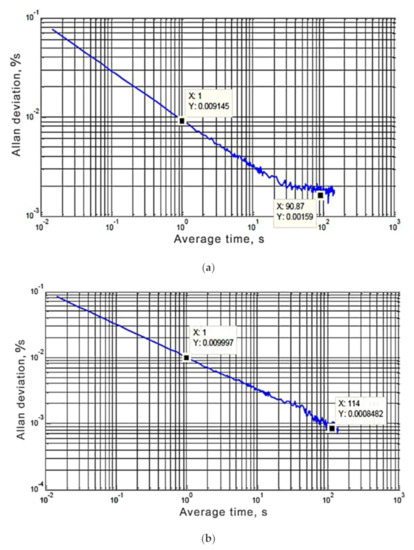 The power spectral density is defined as the bilateral Fourier transform of a correlation function . The Allan variance is a method of time sequences analysis for determining noise characteristics as a function of average time and can be found by results of recording and output signal from the gyroscope, based on a stationary platform. The gyroscope’s output signal recording consists of N samples with duration . The total length the recording is . This method was originally developed to evaluate standard frequency errors. Later, it was actively used for estimating parameters of inertial sensitive elements (recommendations to use this method of analysis are given in the IEEE standards [12,13].