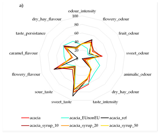 The sensory profile of adulterated and authentic acacia honeys is shown in Figure 1a. The evaluation revealed significant differences between the reference and adulterated honeys in four parameters: A10 honey reached a significantly higher score for fruity odour, A10 and A50 received significantly lower sweet taste and flowery taste scores, while A20 and A50 had significantly higher caramel taste scores compared to reference honey (p < 0.05), based on results of ANOVA test followed by the Games–Howell post hoc test. However, other parameters showed differences that were not statistically significant: adulterated honeys had lower odour scores (odour intensity and fruity odour) and higher values in sweet odour, animalic odour, fruit odour and dry hay odour. Taste parameters showed lower values in the case of intensity, sweetness, flowery, dry hay taste and taste persistence. Higher values were obtained for caramel flavour and sour taste. The EUnonEU acacia honey showed significant differences from at least one of the authentic honeys in flowery, sweet and animalic odour and in sweet, flowery and caramel taste. Sugar composition analysis showed that the EUnonEU honey blend had higher glucose and fructose contents (312.41 g/kg and 503.42 g/kg) than the reference honey (285.04 g/kg and 414.64 g/kg), which can explain of the sweeter taste and odour perceived.