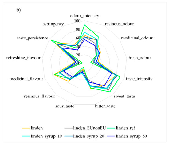 The results of the linden honey sensory evaluation (Figure 1b) showed significant differences between reference and adulterated honey for eight parameters (p < 0.05): L10 was significantly different in fresh odour; L20 was different in sour taste; L50 was different in bitter taste and medicinal flavour; and L10, L20 and L50 were different in taste and odour intensity and in sweet taste. Odour intensity, resinous odour, taste intensity, sweet, bitter, medicinal taste, astringency and taste persistence were weaker in adulterated samples, while refreshing and sour taste, and fresh and medicinal odour were stronger compared to the reference linden sample. The mixture of EU and non-EU originated honey showed significant differences from at least one of the authentic linden honeys in seven parameters: taste intensity and persistence, refreshing, medicinal and bitter taste, taste intensity, resinous odour and odour intensity. Turkish researchers found also significant differences in aroma, taste and odour between pure and adulterated honeys [19].