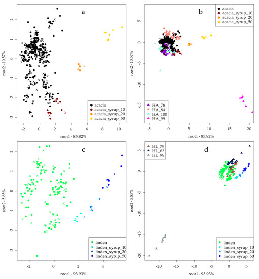 Results of electronic tongue linear discriminant analysis (LDA) models for the classification of authentic and adulterated acacia (a) (n = 381) and linden (c) (n = 148) honeys and independent prediction of EUnonEU blends for acacia (b) (n = 381 + 66) and linden (d) (n = 148 + 59) honeys; ● training, ✖ validation and ▲ independent prediction.