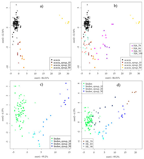 Sugar syrup (glucose-fructose) was mixed with an authentic acacia and an authentic linden honey in concentrations of 10% (1:9), 20% (1:4) and 50% (1:1), resulting in three model adulterated samples for each botanical type. These are coded as A10, A20 and A50 and as L10, L20 and L50, where “A” is for acacia and “L” is for linden. The numbers denote the concentration of sugar syrup in %.